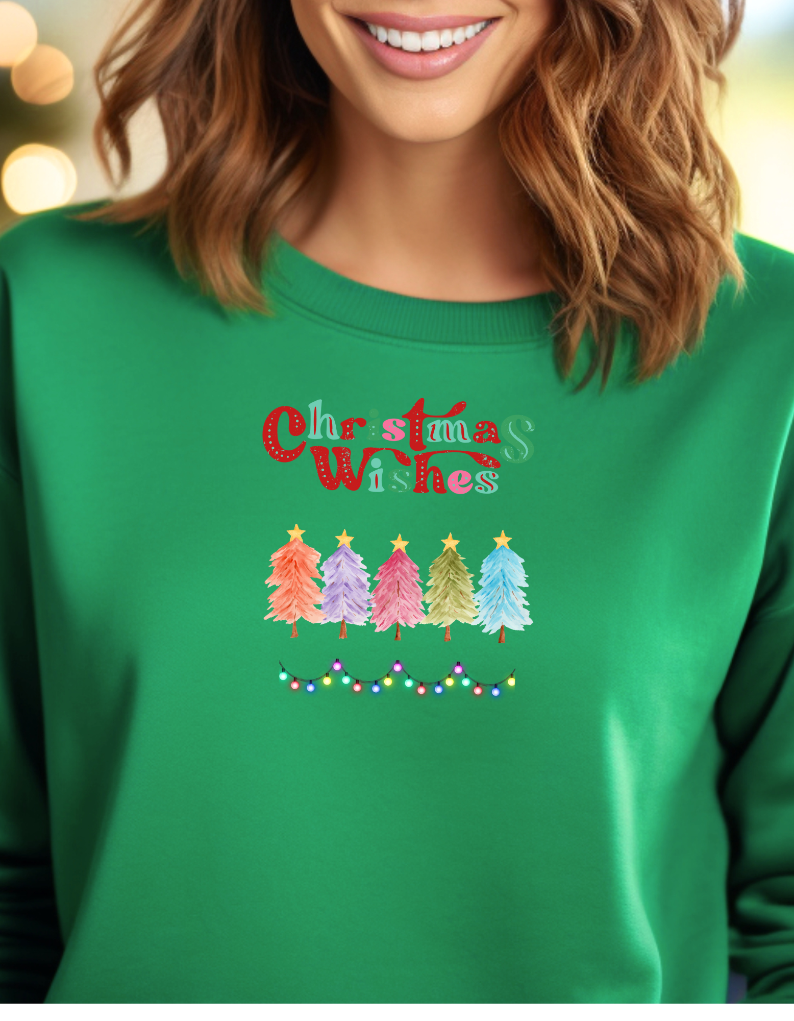 Wrap yourself in the warmth and wonder of the season with our Christmas Wishes sweatshirt. Featuring five colorful and uniquely styled Christmas trees, this cozy design brings a playful yet elegant touch to your winter wardrobe.